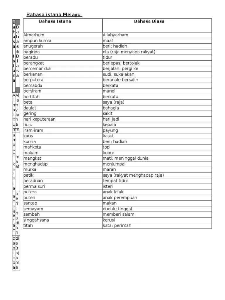 1, anak, paduka anakanda, pacal didik. Lagi gambar yang mengandungi tambahan bahasa istana untuk anda teliti dan fahaminya. 2, ayah/bapa, paduka ayahanda, hamba tua ayah. Bahasa istana bahasa biasa murka marah patik saya (rakyat menghadap raja) peraduan tempat tidur. Senarai bahasa istana boleh diperoleh daripada pihak istana sultan. Bil perkataan maksud 1 baginda panggilan .